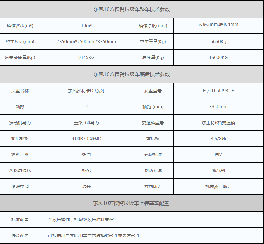 东风10方摆臂式垃圾车详细配置一览