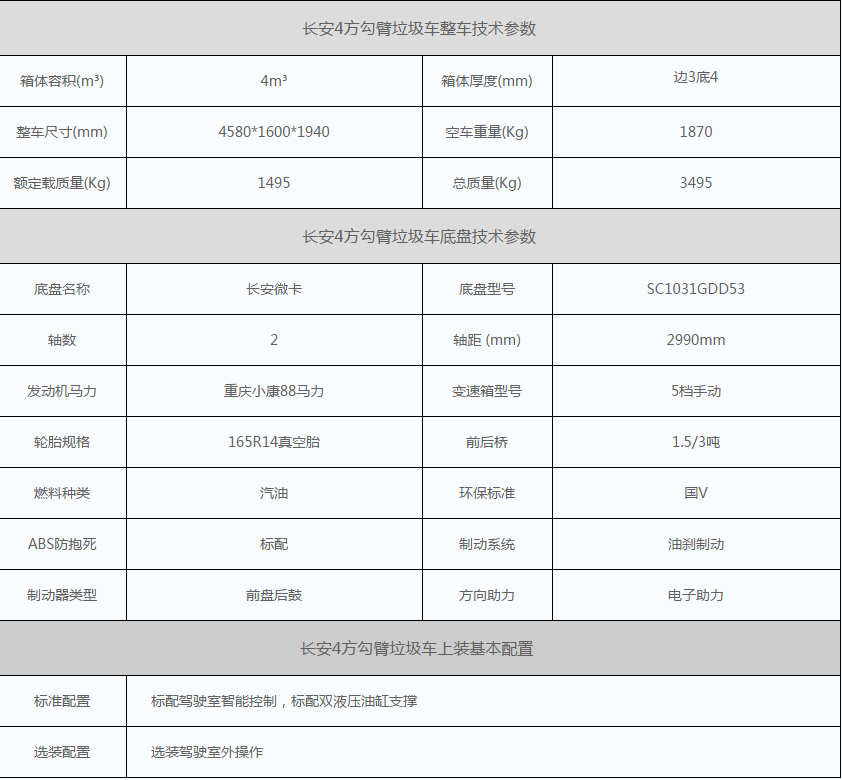 长安4方勾臂式垃圾车,采用长安星卡系列微卡底盘,长安经典单排驾驶室,轴距2990mm,采用重庆小康88马力高性能汽油发动机,正宗国V排放标准,配5档手动变速箱,起步轻快,提速有力。配置方面,标配电子EPS方向助力,转向轻盈,驾驶更轻松,后双轮设计,承载能力更强,前轮制动采用先进的盘式制动器,相比传统的鼓式制动,热衰减少,制动效果更佳。