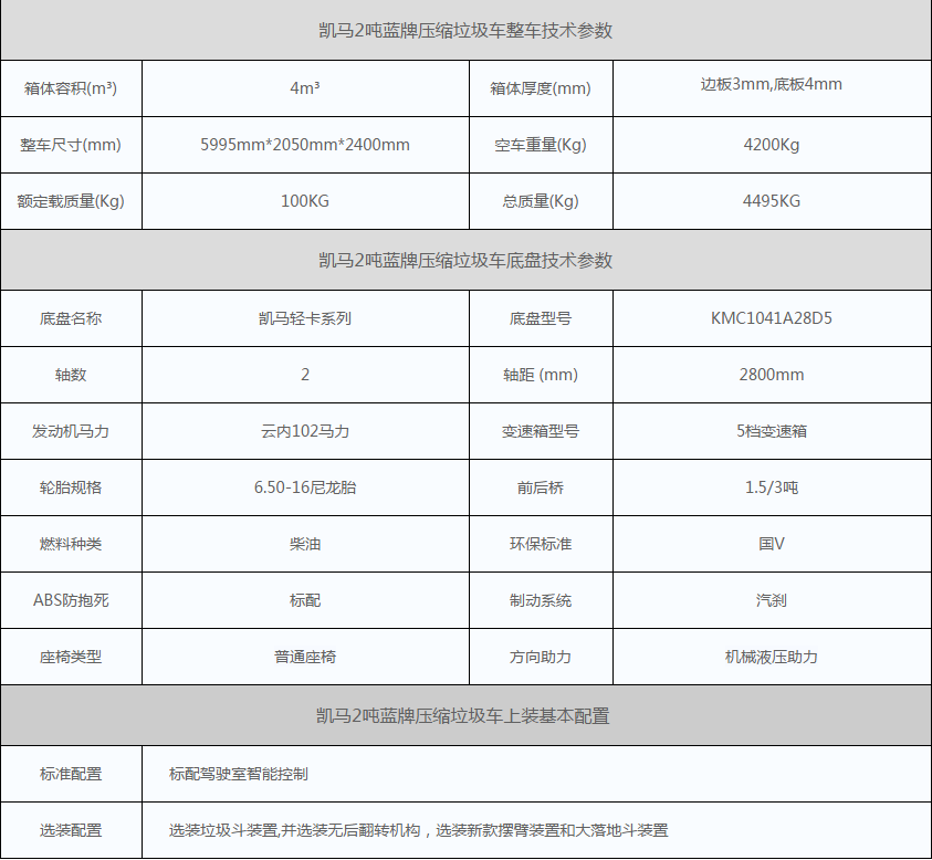 凯马2吨蓝牌压缩式垃圾车,采用凯马环卫车系列底盘,单排可前翻驾驶室,托运翻转设计,检修更方便。云内102马力高性能柴油发动机,同级动力最强,正宗国V排放标准,性能卓越,品质有保证,配5档手动变速箱,传动效率高,驾驶体验好。原厂方向助力、离合助力、ABS防抱死系统、汽刹制动,配置分配合理,实用性强。