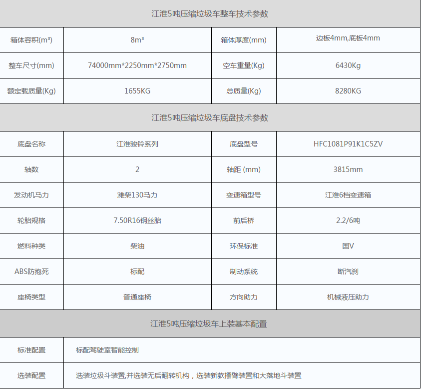 江淮5吨压缩垃圾车,采用江淮骏铃系列环卫车专用底盘,单排可前翻豪华驾驶室,手动翻转设计,检修更方便。潍柴130马力柴油发动机,正宗国V排放标准,省油经济,配江淮六安6档手动变速箱,传动效率高,驾驶体验好。原厂方向助力、离合助力、ABS防抱死系统、断汽刹,配置分配合理,实用性强。