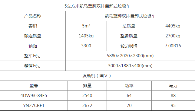 凯马蓝牌双排自卸式垃圾车,锡柴88马力(带DPF),新款五十铃级双排车身,5档变速箱,1063前后桥,7.00R16轮胎,汽刹,方向助力,ABS,原厂空调。
