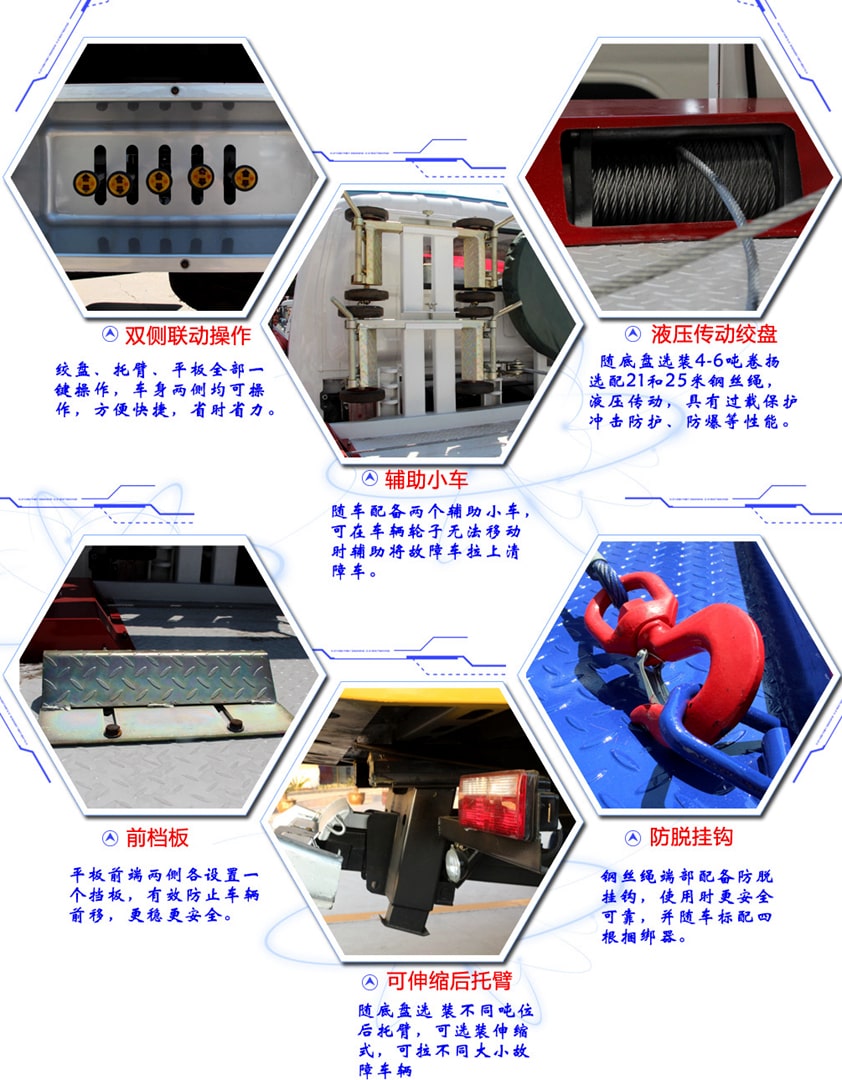 大运蓝牌一拖一清障车,C证即可驾驶。6吨联体上装,配4吨液压绞盘,进口液压系统,双侧联动操作,25米钢丝绳,U型抱胎装置1套,随车工具一套,绑带4条,后工作灯3只,辅助灯总成1套,辅助气管总成1套,配黄色长排警灯一个。我公司清障车采用国外先进娴熟产品技术、生产工艺,全进口密封件,加强型横梁固定,增强了承载能力。