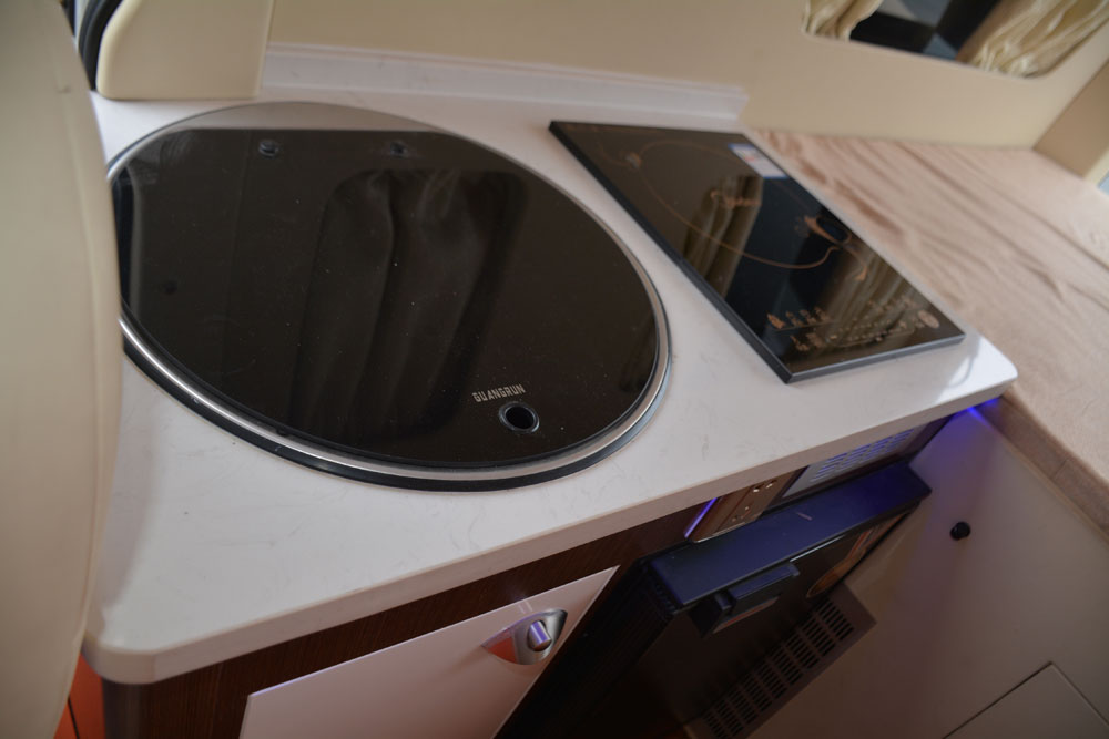 车辆的储物柜和厨房.电冰箱.微波炉(烤箱)和美的全套房车厨房系统.洗.做.切一体式.无烟低噪音抽烟机让你移动的家没有一点异味.固定的电磁炉,可以在让你清晨起来有碗养胃的粥.夏天户外的烧烤。冬天房车里的火锅.走到哪里都有美食相伴.
