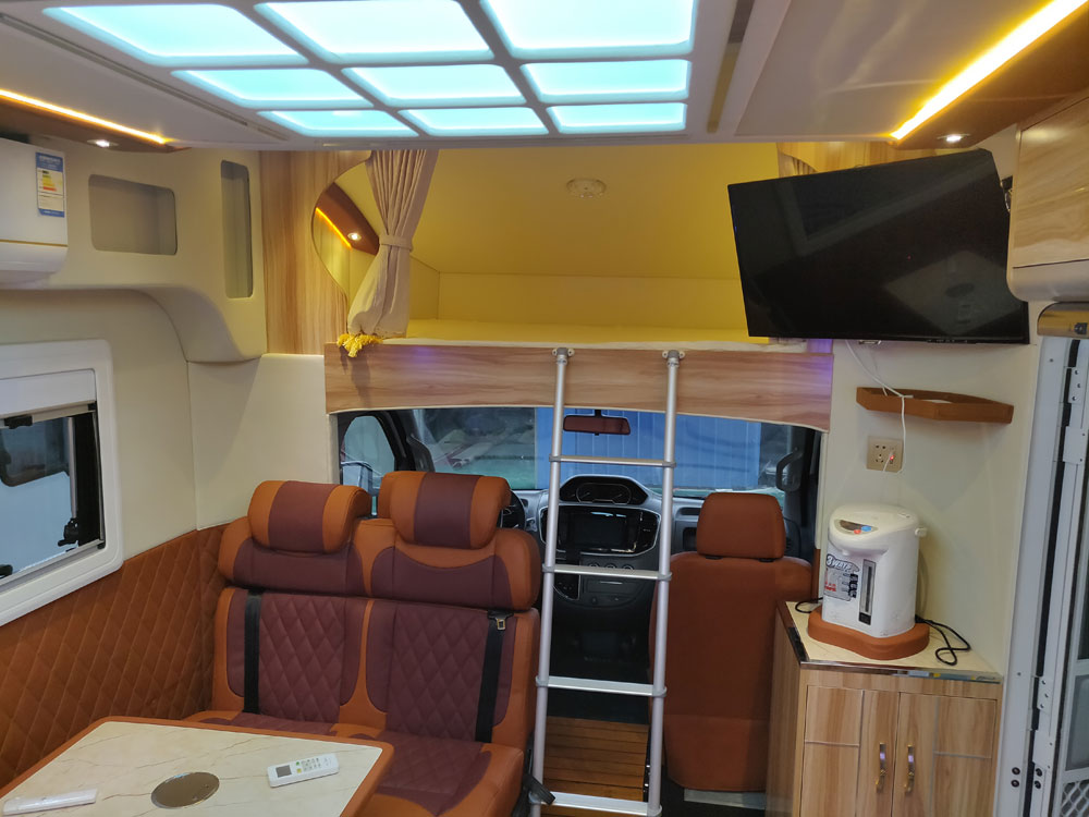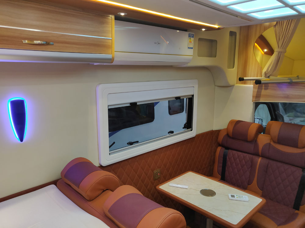 方便的出入会客区和驾驶位,高清显示屏可以接收电视信号和一些USB,蓝牙的音频播放功能.外出不管是追剧还是看电影看娱乐都不会落下.把显示屏放到以后上面是一个床位.娱乐休息两不误.显示屏下方可以放置茶壶.咖啡机.在旅居中开启休闲的生活.