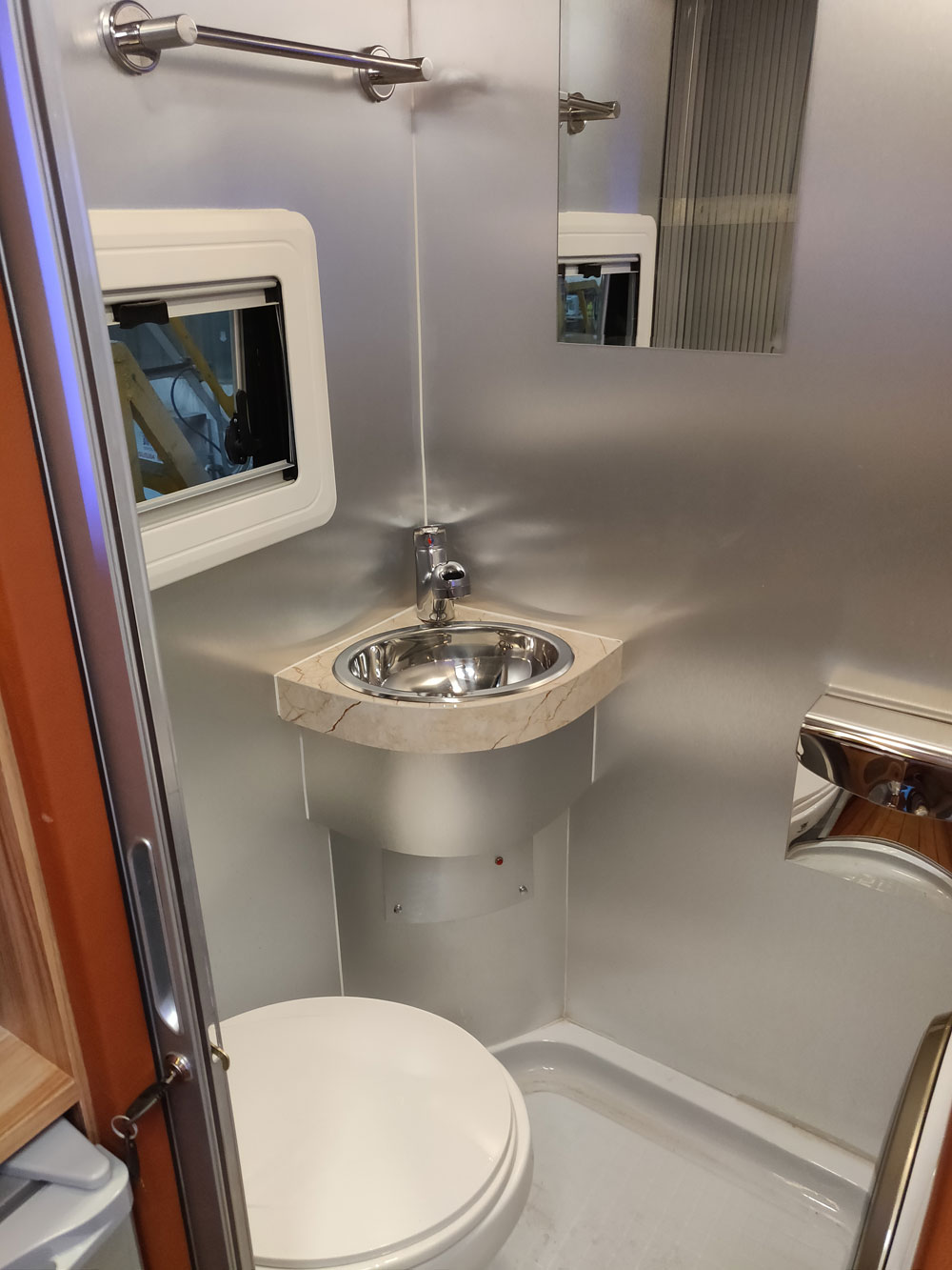 卫生区域马桶,洗漱台,花洒,热水器样样齐全。热水器在车辆行驶过程中可以自行供电,不闭为没有热水澡而烦恼.