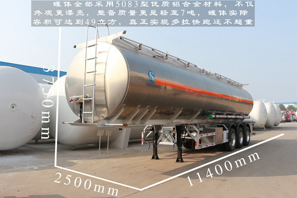 严格按照国家公告外形及罐体尺寸生产,罐体容积38方、40立方、42方、43方、46方、50方,  单仓结构,采用5083型优质铝合金材质制作,筒体6mm,封头7mm厚,防浪板4mm厚,7块防浪板,一个气动海底阀,两个欧标罐口,两个进料口,罐顶围板内铺防滑钢网,罐尾左右各一个DN80自流阀带保护箱,罐体中段骨架上一个自流阀带保护箱(能与牵引头快速连接),后爬梯,两根输油管,两个大灭火器。其余厂内标配。 |