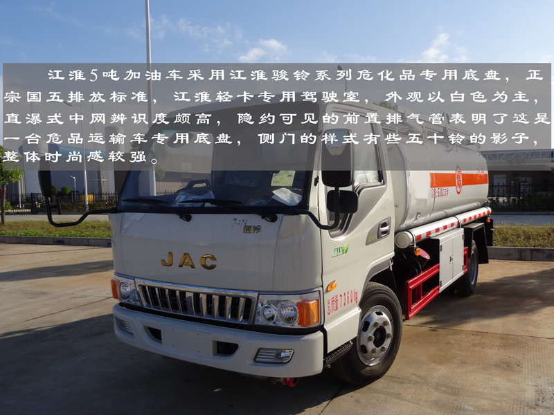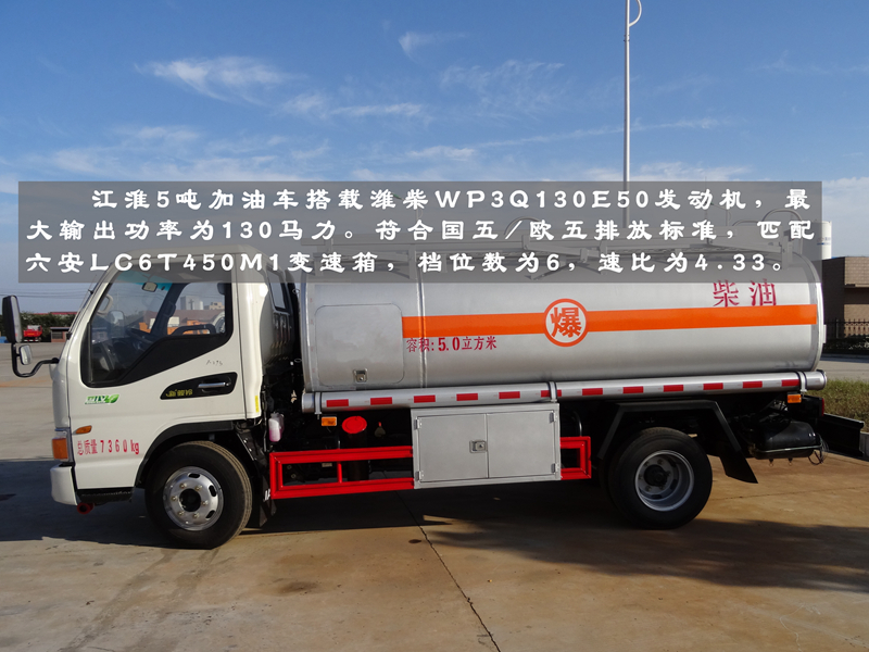 江淮5吨加油车,选用江淮骏铃系列危险品专用底盘,正宗国V排放标准,配潍柴130马力高性能发动机,动力充沛,搭配江淮6档变速箱,换档流畅。5吨超大后桥,7.00钢丝胎,承载能力强。前轮盘式制动器、ABS、限速装置、排气管前置带防火帽,符合国家对危险品车辆的相关要求。原厂空调、方向助力,大大的提高了驾驶和行车的舒适性。
