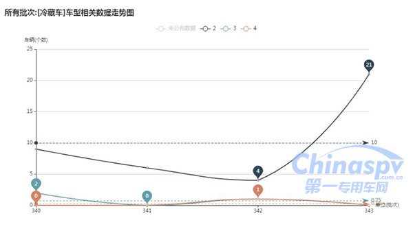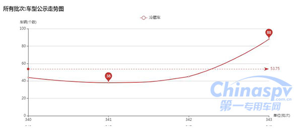 从4个批次的冷藏车的发布数量看,343批次最高,341批次最低。4批次平均值为53台。