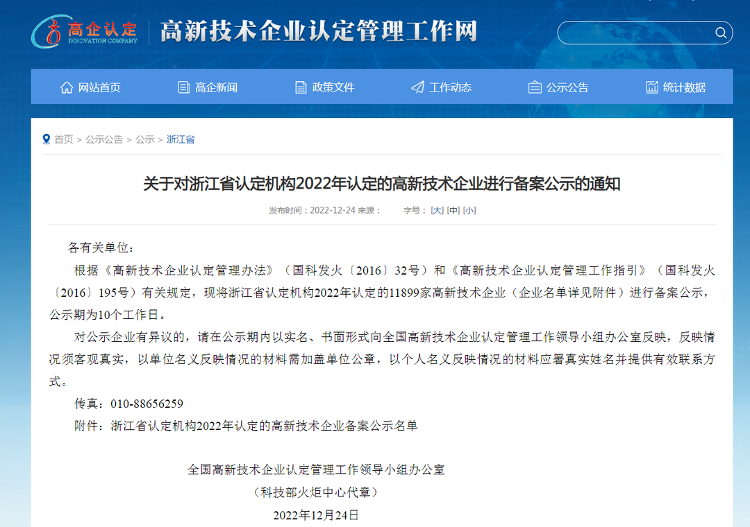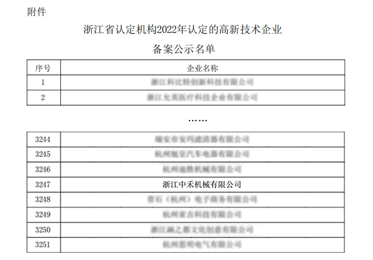 2022年12月24日,全国高新技术企业认定管理工作领导小组办公室发布了《关于对浙江省认定机构2022年认定的高新技术企业进行备案公示的通知》,浙江蓝狮在线机械有限公司荣获“国家高新技术企业”称号。
